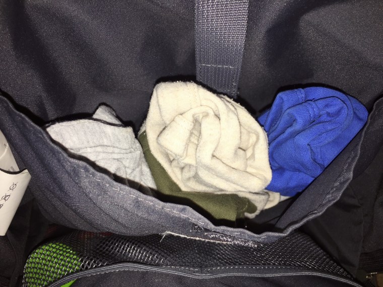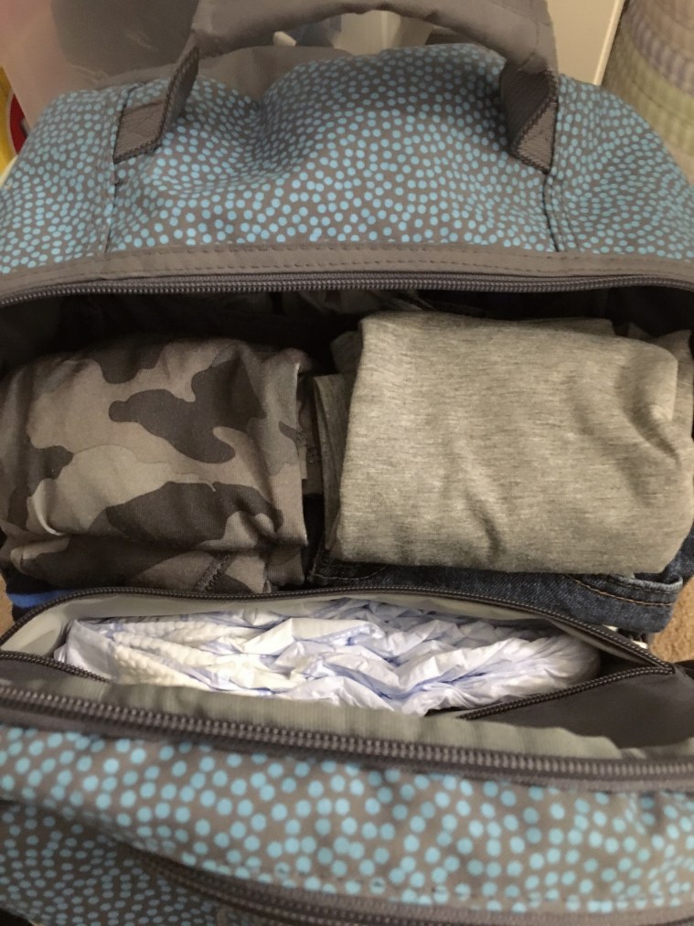 I packed enough diapers for 3๏ธโƒฃ days and a whole new pack of wipes. Vinny will go through up to 4๏ธโƒฃ diapers in a day, so I fit 12 size 5’s in the front pouch of the bag, three overnights in a zipper compartment of the inside, and the wipes inside of the bag next to and underneath his clothes.