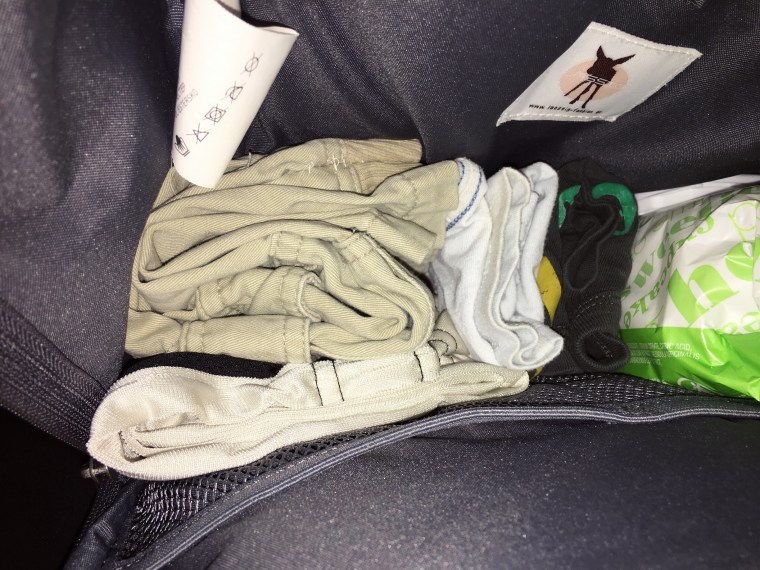 I packed a couple pairs of pants. One pair of “Kicking Around The House” track pants, and one nice pair of nice khakis in case my in-laws want to take him out of the house. He also has the jeans to reuse if needed.
