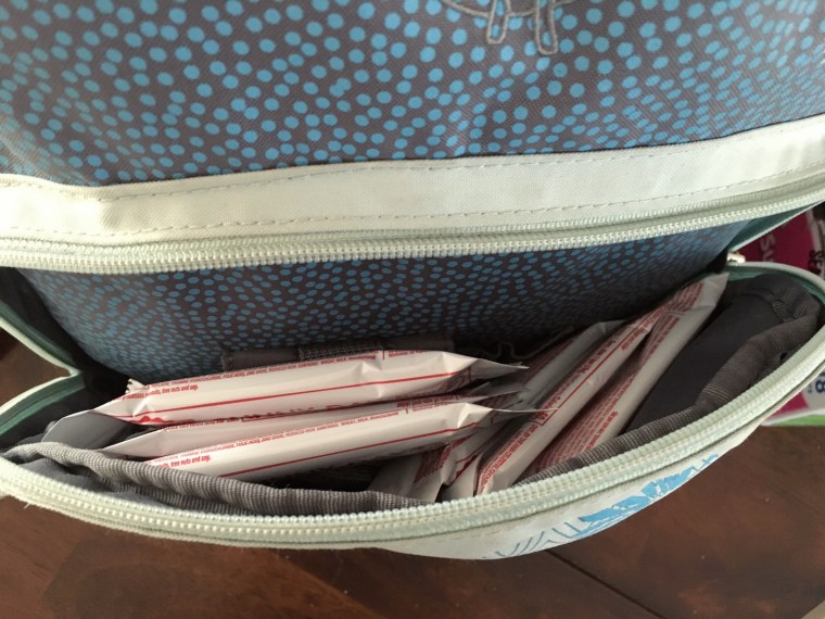 Also not pictured are his ibuprofen and syringe (in case of teething), eating utensils, binkies, and toothpaste and toothbrush. I was able to fit these things in the “hidden” compartments.