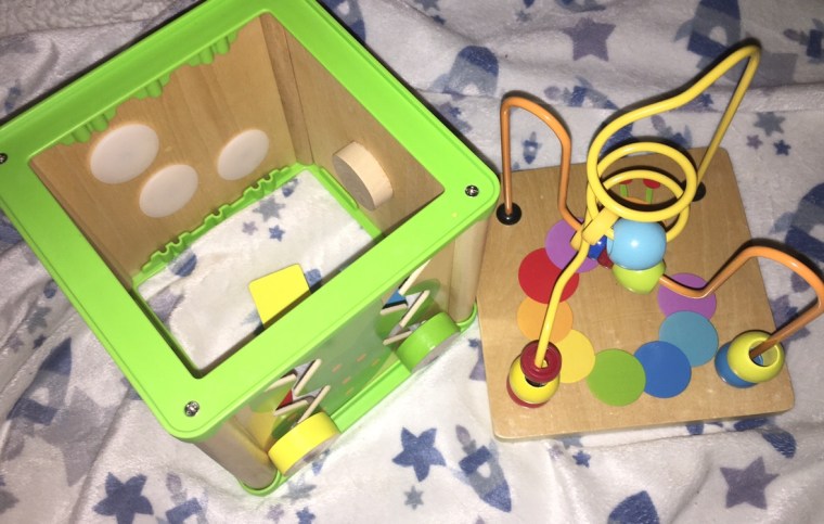 We found this guy on Amazon–we had gotten an Amazon gift card for our Baby shower which we used for gifts this year (we’d already gotten all we needed for our little guy), and found a waiting room toy for relatively cheap. We feel he’ll enjoy all of the multiple functions of this toy, the bead dragging, shape-fitting, etc, as he gets old enough to play on his own.