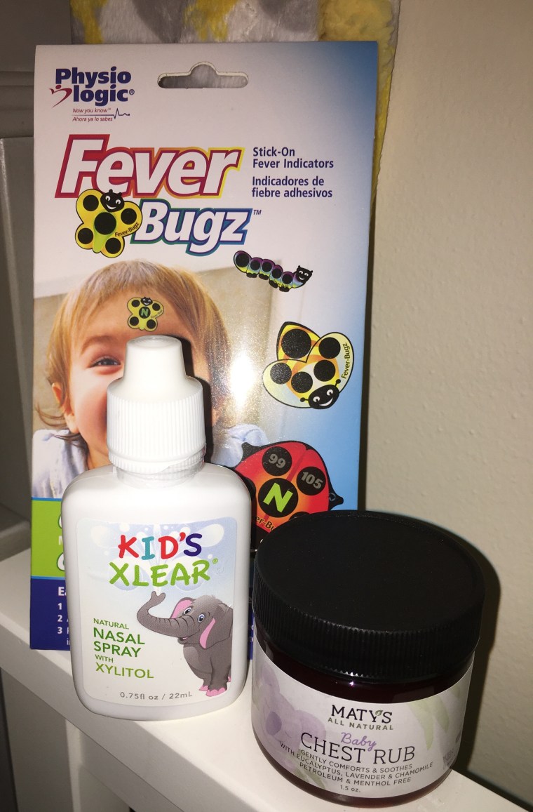 Our Little Vinny has already had his first cold (at least we suspect so), so we purchased him some cold supplies. We found a nice all-natural version of vapo-rub for babies to rub on his chest and feet, an all-natural saline spray for stuffy nose, and fever bugs to stick on his forehead to see if he’s got a fever and/or bug!